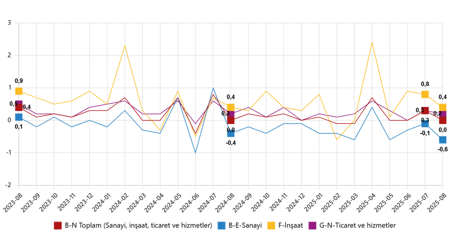 Sanayi, inşaat ve ticaret-hizmet sektörleri toplamında ücretli çalışan sayısı 2025 Ağustos ayında bir önceki aya göre yüzdesel olarak değişim göstermedi.