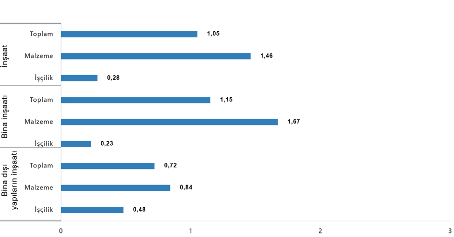 Bina dışı yapılar için inşaat maliyet endeksi, bir önceki aya göre %0,72 arttı, bir önceki yılın aynı ayına göre %23,75 arttı. Bir önceki aya göre malzeme endeksi %0,84 arttı, işçilik endeksi %0,48 arttı. Ayrıca bir önceki yılın aynı ayına göre malzeme endeksi %19,94 arttı, işçilik endeksi %32,37 arttı.