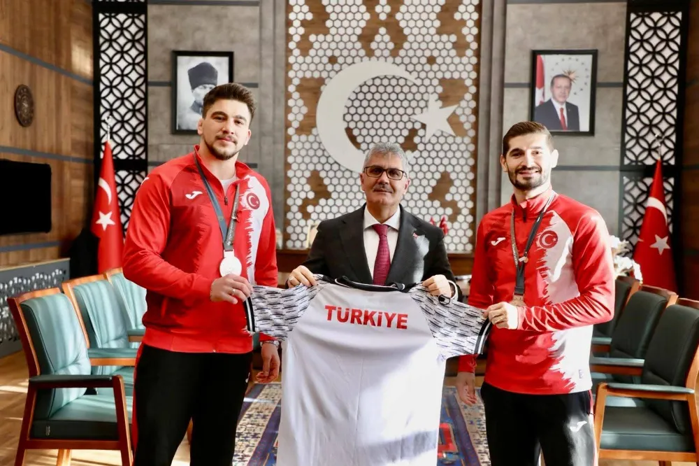 Tokyo’da 16–25 Kasım 2025 tarihleri arasında gerçekleştirilen Deaflympics Olimpiyat Oyunları’nda Türkiye’yi temsil eden Niğdeli milli güreşçiler önemli bir başarıya imza attı. Grekoromen güreş 87 kilogramda Kasım Ahmet Talha Kacur, 67 kilogramda ise Kadir Kuş bronz madalya kazanarak Niğde’ye uluslararası düzeyde gurur yaşattı. Başarılı sporcular, Niğde Valisi Cahit Çelik’i Valilik Makamı’nda ziyaret etti. Ziyarette sporcuların elde ettiği derecelerin hem Niğde hem de Türkiye adına büyük anlam taşıdığını ifade eden Vali Çelik, “Niğdeli sporcularımızla gurur duyuyoruz. Uluslararası arenada ay-yıldızlı bayrağımızı temsil eden sporcularımız, azimleri ve disiplinleriyle gençlerimize örnek oluyor” dedi. Vali Çelik, sporcuların başarısında emeği geçen antrenörleri ve aileleri de tebrik ederek, Niğde’de sporun her branşta desteklenmeye devam edeceğini vurguladı. Ziyaret, günün anısına çekilen hatıra fotoğrafıyla sona erdi.